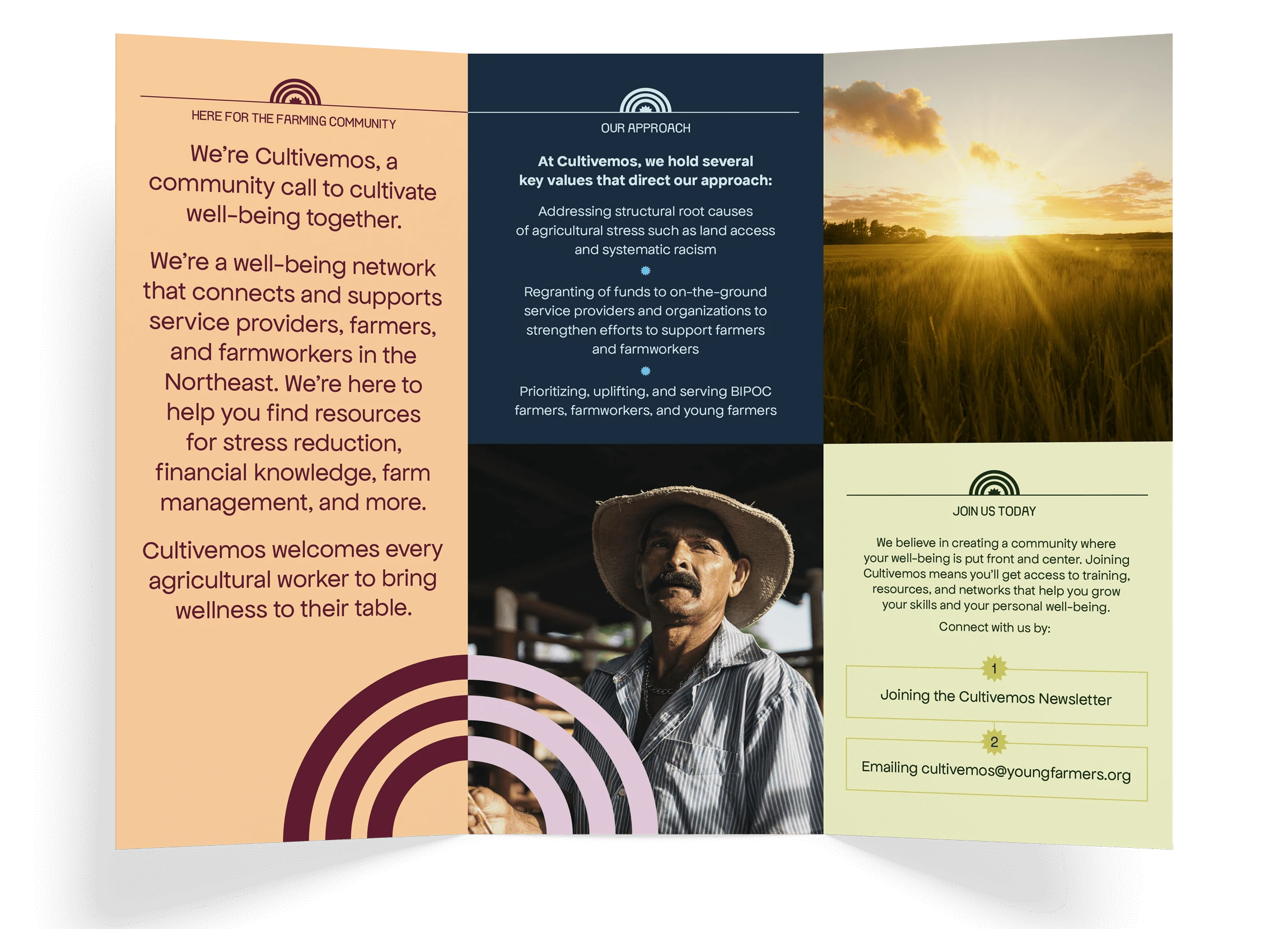 Cultivemos (formerly known as FRSAN-NE, the Farm and Ranch Stress Assistance Network Northeast) is dedicated to advancing the well-being of agricultural producers, workers, and their families through accessible and effective mental health care and assistance programs. They aim to improve mental and behavioral health awareness, literacy, access, and outcomes for the agricultural community in the Northeast by focusing on management skills, tools, robust support systems and effective stress management techniques. The Cultivemos brand identity is inspired in two parts. The changing of light, a hallmark of the farmer’s lifestyle and an indication in the shifts in time of day, seasons, and harvests, is reflected through sunrise and sunset gradients and grainy photography treatments. The prismatic nature of a rainbow, signaling hope and optimism in challenging times as well as diversity and inclusivity, a crucial pillar of Cultivemos, resonates through an accessible, wide-range, complimentary color palette. The Cultivemos brand builds a sense of harmony through strength that feels reflective of the brand’s goals and mission.