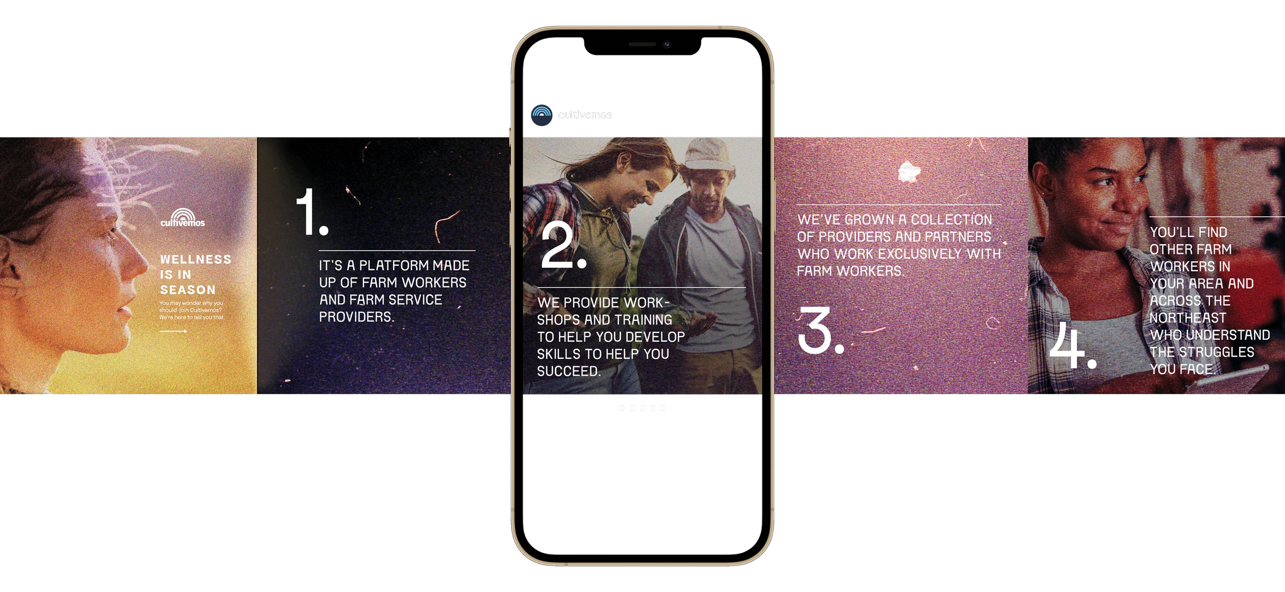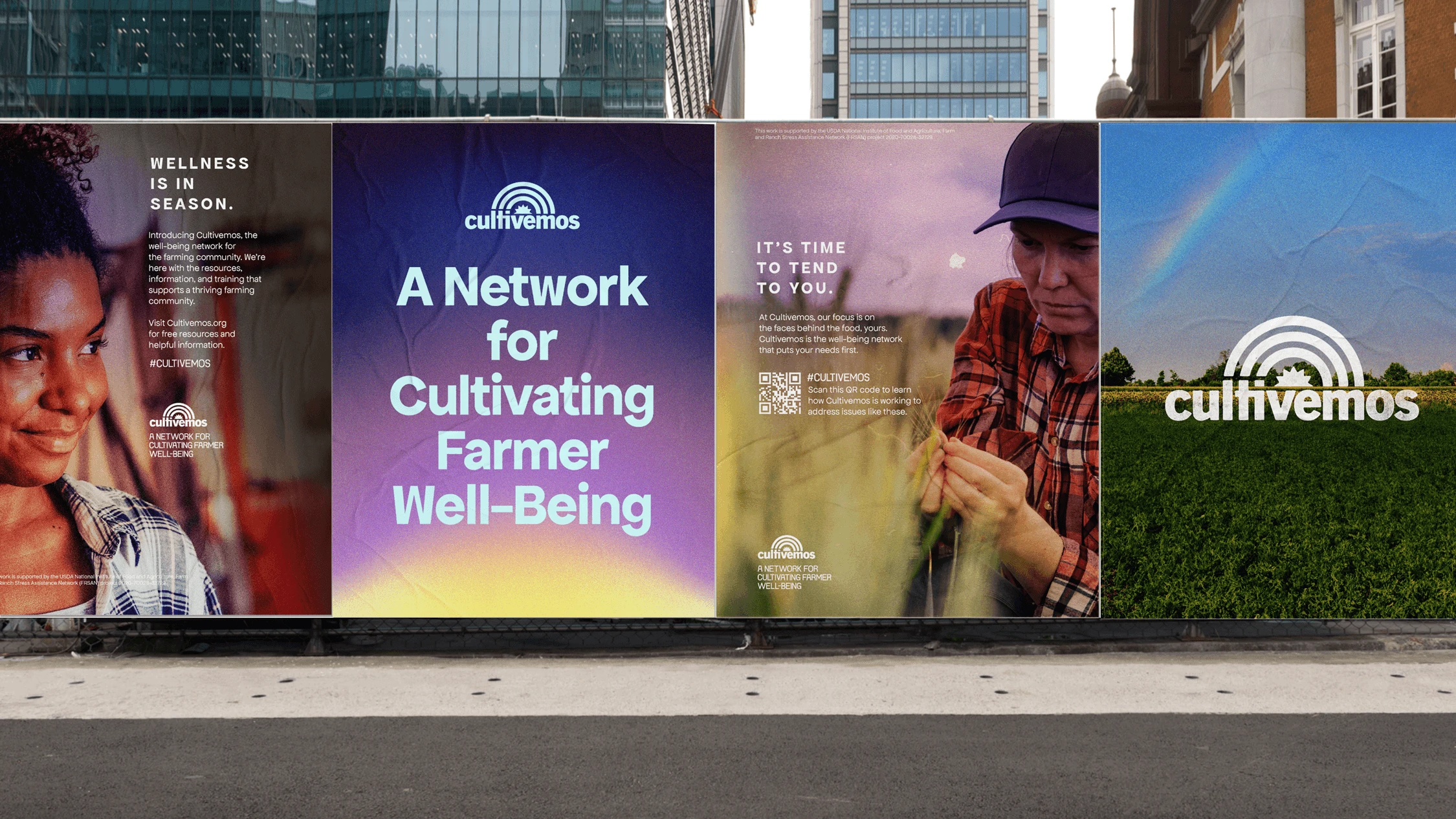 Cultivemos (formerly Farm and Ranch Stress Assistance Network Northeast) provides mental health support and resources for farmers, agricultural workers, and their families across the Northeast. The organization needed a new identity that could communicate care, trust, and resilience while acknowledging the unique pressures of agricultural life. We developed a brand system rooted in the rhythms of farming itself. The visual language draws from the changing light that defines a farmer’s day, sunrise and sunset, expressed through warm gradients and textured, documentary-style photography. These elements reflect the cycles of time, seasons, and harvest that shape life in agriculture. Color plays an important symbolic role in the system. Inspired by the prismatic qualities of a rainbow, the palette introduces a broad, accessible spectrum that communicates hope, inclusivity, and optimism during difficult moments. Together, the identity balances warmth and strength, creating a visual system that feels supportive, human, and deeply connected to the agricultural community it serves.